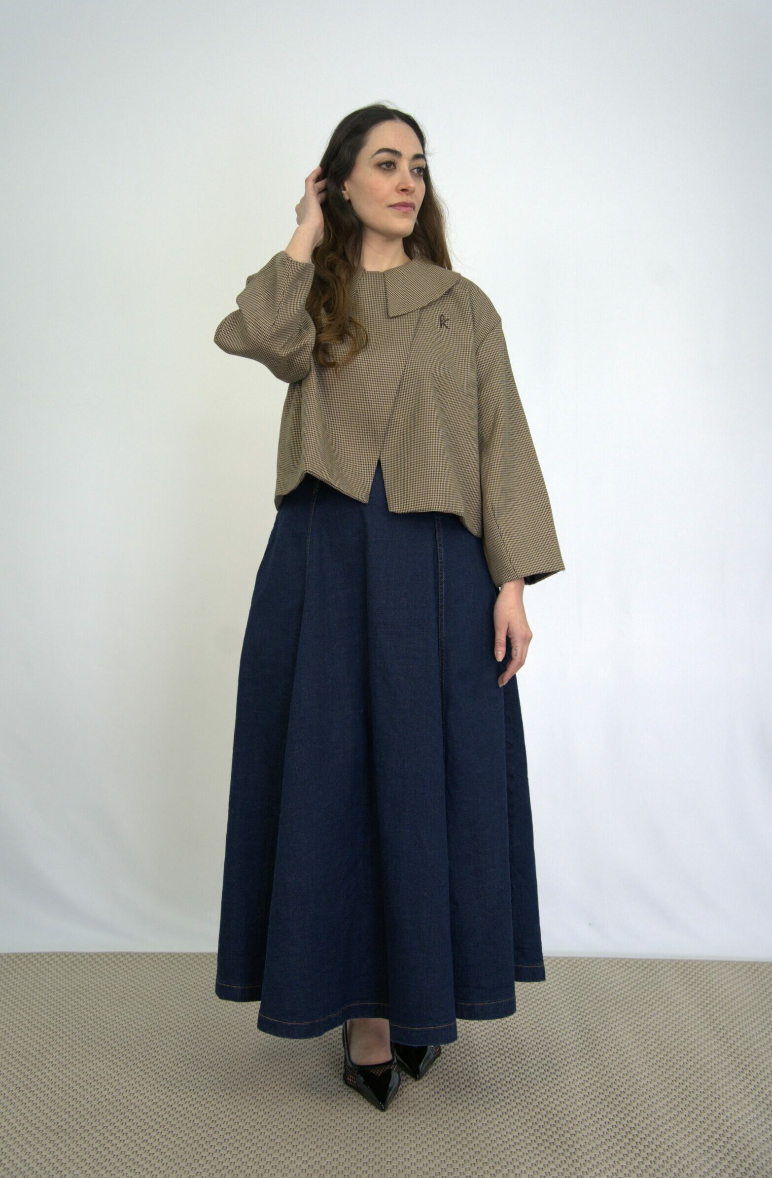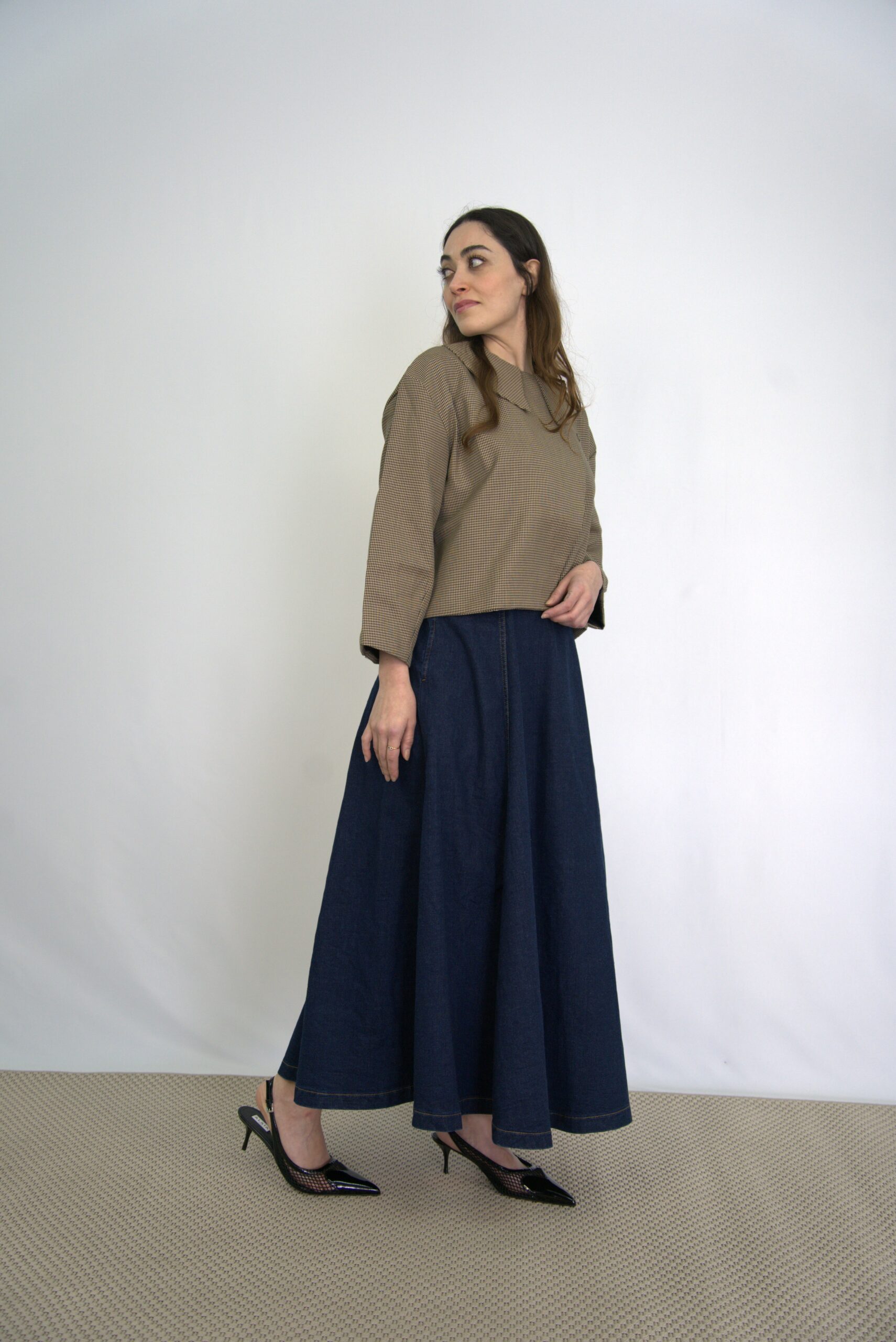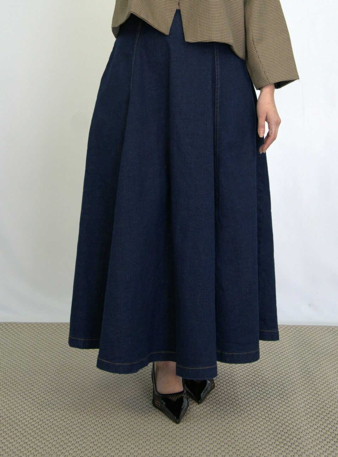 Jupe en jean longue taille haute. Coupe évasée à panneaux multiples, apportant volume et mouvement. Poches latérales et fermeture invisible au dos.