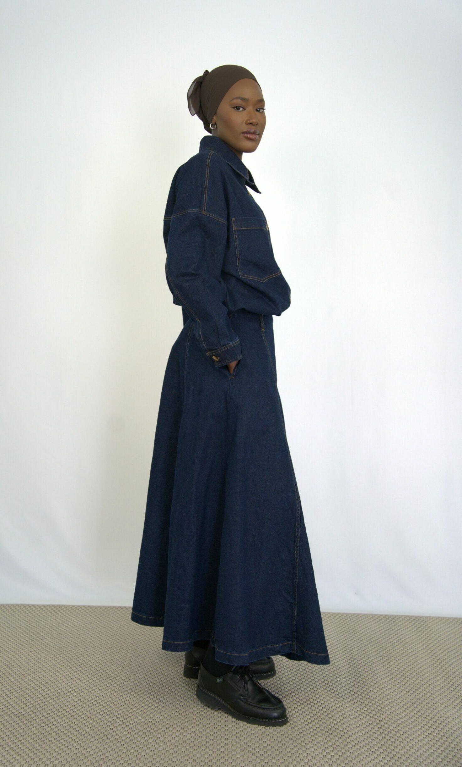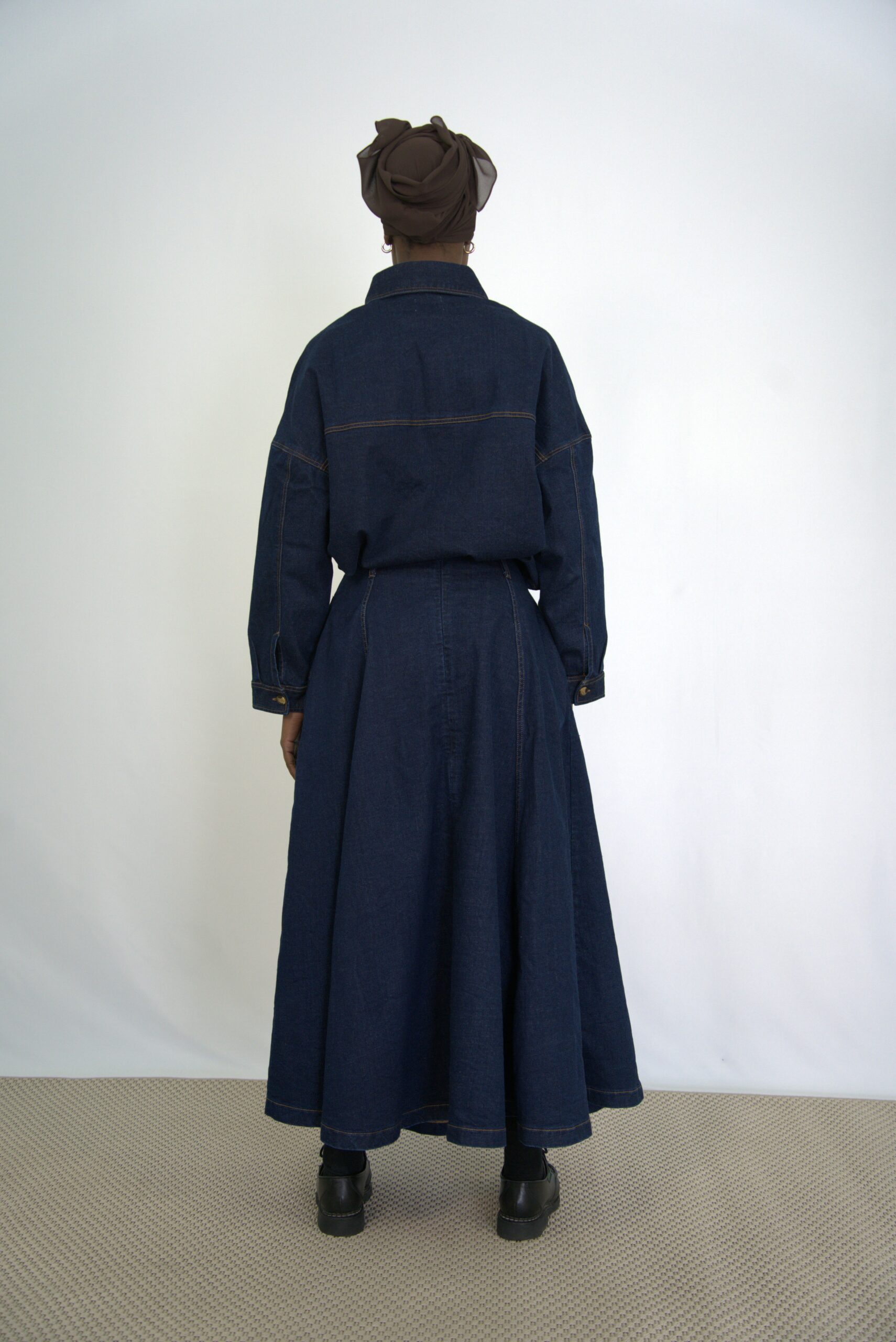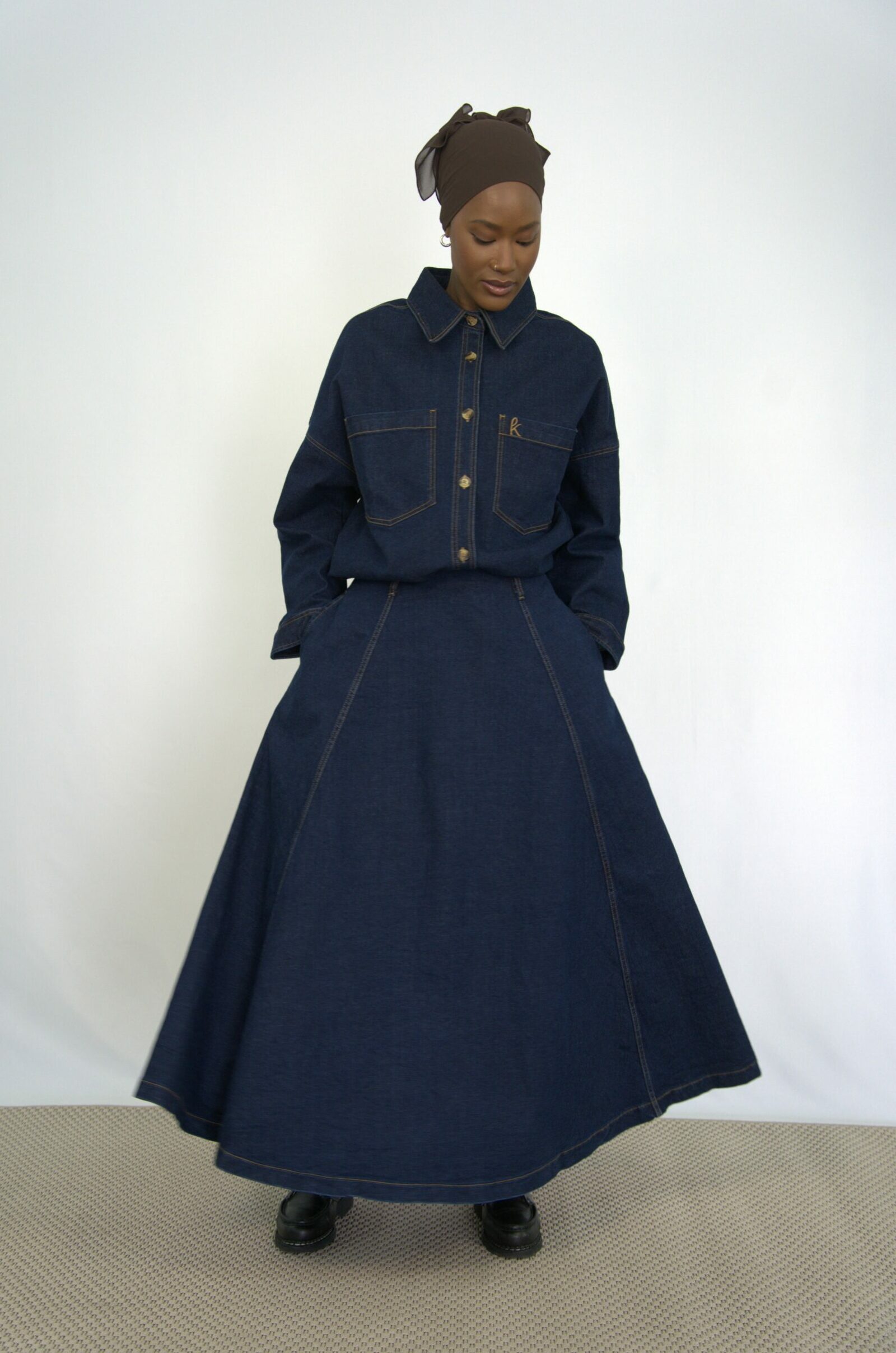 Jupe en jean longue taille haute. Coupe évasée à panneaux multiples, apportant volume et mouvement. Poches latérales et fermeture invisible au dos.
